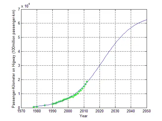 As in the graph, we can see that the highway system in China is still in the growth phase but reach the k/2 point which means the growing speed began to decrease. We can notice a huge increase of network length in 2005. The growth of the high-level highway was not this shape. So growth might mainly relate to the construction of low-class highways that connect small cities and towns. The accessibility of such small cities and towns increased rapidly during the year. This discontinuity has a negative impact on the model fitting which made the beginning of the model underestimate the total length of the highway network before 1990. After the huge jump in the year 2005, the growth of highway length was slow and steady which shows an almost straight line in the graph. The number of private passenger vehicles, however, has not reached the k/2 yet which means it will keep growing faster and faster. The growing of highway length is slowing down which might not fulfill the increasing demand. The passenger-km of the highway is also below the k/2 and growing faster, too. According to these data, there will be more congestion and lower service level for the highway system in the recent future. In order to change this, a policy of increasing highway construction should be carried out.