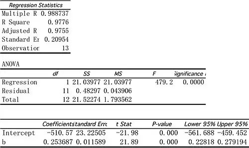 The regression result for K=1200 is shown in the table below. The result shows that b=0.2537, intercept is -510.57. So the t0 (year in which 1/2 K is achieved) is 2012.49507, which means half of annual ridership of saturation is reached just months ago.