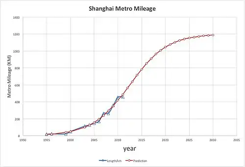 The S-Curve fits the real data pretty well. Before 1995, there was no metro line in operation. During the year 1995-2011, the network mileage was growing at an increasing speed. According to the S-Curve model, the year 2012 is the year when 1/2 K is achieved, which means that the system will still grow, but the rate is probably slowing down. Around 2030 the mileage will start to level off at around 1200 km. However we need to pay attention to this S-curve too. The network growth of Shanghai Metro so far is following the metro plan pretty well. According to the plan for next phase, the mileage is going to increase to 880 km in 2020. But on the S-Curve the estimated mileage for 2020 is higher than 1000 km already.