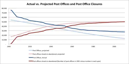 Notably, both mail handled per person and post offices per 10,000 people peaked before the absolute measures of mail handled and post offices. Even before the rural home delivery policy in 1901 that precipitated the closure of many post offices, fewer post offices were needed to serve the same number of people. This could be explained by urban home delivery, increased efficiency of operations, or better supporting transportation infrastructure. Mail volumes per person peaked in 2000 and has been declining. This can reasonably be explained by shifting information technologies and the rise of electronic transmission supplanting physical print material delivery.