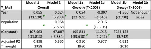 Since the peak volumes of mail handled occurred in 2006, there were not enough data points to conduct a meaningful analysis of the decay phase while controlling for population. Even though Model 1b has t statistic values with a magnitude greater than 2, this model should be considered with caution because it only contains 4 years of data. Conversely, since the decay phase is only evident in the final 4 years of data, the overall models (Model 1 and Model 2) fit the data almost as well as the growth-specific models (Model 1a and Model 2a).