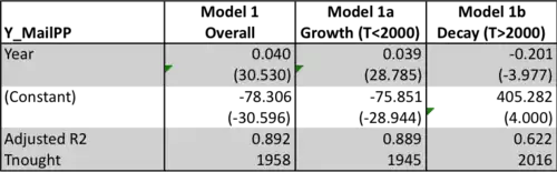 The value for Model 1b reinforces the decay model's weakness: 2010 is the final year of available data, so it is unreasonable to expect with any certainty that 2010 will indeed be the inflection point on the decay curve. The decay model assumes that mail volumes will ultimately drop to zero as other modes replace it quickly, while it is easy to imagine the postal service retaining modest importance as other modes slowly substitute in.