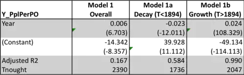 Unlike the mail volumes model, post offices peaked in 1901 and the overall models are not a very good fit for the data, with values below 0.355. The coefficients are not consistent with our knowledge of the post office trends: Models 1 and 2 have positive coefficients for time, when it is evident from the graph in the descriptive statistics that the number of post offices has been in decline for over a century.[7]