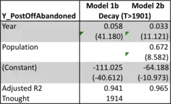 This model fits the post office data much better than simply the number of post offices from 1901 to 2010. Model 1b has values of 0.941 for the post office closure data and 0.747 for the number of post offices data. Model 2b has values of 0.965 for the post office closure data, again compared to 0.790 for the number of post offices.