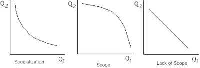 This can be represented graphically as in the diagram on the right. In production space an isoquant would link two outputs and would have the interpretation of an isoinput line, that is, it would be the combination of outputs which are possible with a given amount of inputs. If there were economies of scope, the line would be concave to the origin, if there were economies of specialization it would be convex and if there were no scope economies it would be a straight line at 45 degrees.