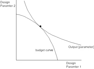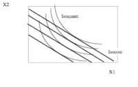 The isoquant model can be used to illustrate the solution of finding the least cost way of producing a given output or, equivalently, the most output from a given budget. The innermost budget line corresponds to the input prices which intersect with the budget line and the optimal quantities are the coordinates of the point of intersection of optimal cost with the budget line. The solution can be an interior or corner solution as illustrated in the diagrams below.