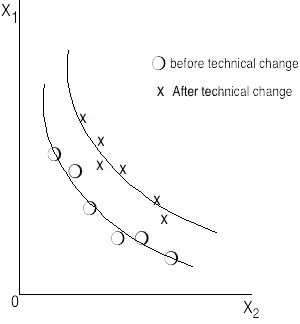 The consequence of technical change is to shift the production function up (or equivalently, as we shall see, the cost function down), it can also change the shape of the production function because it may alter the factor mix.