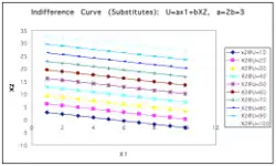 In graphic terms substitutability is greater the more the indifference curves approach a straight line. Perfect substitutability is a straight line indifference curve (e.g. trips to work by mode A or mode B).