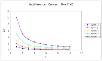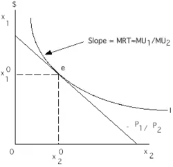 The individual maximizes utility by moving down the budget constraint to that point at which the slope of the budget line () which is the rate of exchange dictated by the market is just equal to the rate at which the individual is willing to trade the two goods off. This is the slope of the indifference curve or the marginal rate of transformation (MRT). A point such as 'e' is an equilibrium point at which utility is being maximized.
