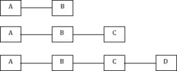 We use the Figure to first introduce accessibility as a network concept. As shown on the top, there are two cities (or nodes), city A and city B. There are therefore two travel markets: A-B and B-A. The middle case adds one city, and one link, but greatly increases the number of travel markets: A-B and B-A remain, but A-C and C-A, and B-C and C-B are added (we increased by four markets to a total of six). One link tripled the number of Origin-Destination (O-D) pairs served. The bottom case adds one more link (for a total of 3), but the number of markets again increases significantly: we still have A-B, B-A, A-C, C-A, B-C, and C-B; but now we also have A-D, D-A, B-D, D-B, and C-D and D-C. The number of markets doubled (we increased by 6 markets to a total of 12).