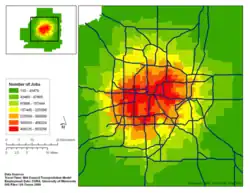 The isochronic or cumulative opportunity measure counts the number of potential opportunities that can be reached within a predetermined travel time (or distance). The Figure shows the cumulative opportunity measure of accessibility to jobs for the Twin Cities metropolitan region measured at 10 minutes of travel time during the morning peak hour from origins.