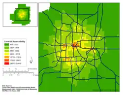 The gravity-based measure developed by Hansen (1959) is still the most widely used general method for measuring accessibility, although it is complex in calculations and has some points of weaknesses. The Figure shows the Twin Cities metropolitan region with the gravity-based accessibility measured to jobs in the region (following equation 3b). The accessibility levels are shown in shades of color. The unit of analysis used in developing this measure is the TAZs, while using the reciprocal of the square of travel time between each TAZ as the impedance function. The attractiveness of a TAZ is calculated based on the number of jobs reported by the LEHD dataset that was previously used in the previous figure. The reciprocal of travel time squared, a common and widely used impedance function, is used as the impedance value when calculating this measure of accessibility.