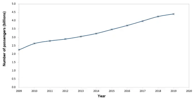 Prior to COVID-19, commercial air travel sustained continued growth between 2009 and 2019. This period of growth was driven by technological advancements (e.g. twin-engine aircraft), proliferation of low-cost carriers and increasing global tourism demand.[34] In 2018, a record of 8.8 billion travellers passed through airports around the world, which marked a 6.4% increase to the previous year.[35] This high demand for air travel translated to significant contributions to the global economy. For example, in 2019, the total estimated revenue of airports around the world was approximately US$178.2 billion, of which 59.9% comprised aeronautical services, 39.2% comprised non-aeronautical services, and 0.9% comprised non-operating revenue.[36]