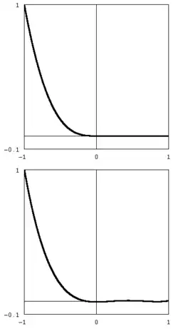 The non-smooth function (top) y = −x3H(−x), where H is the Heaviside step function, and (bottom) the 5th partial sum of its Chebyshev expansion. The 7th sum is indistinguishable from the original function at the resolution of the graph.
