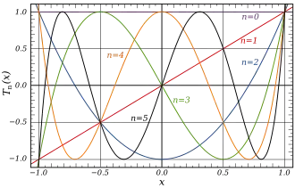 The first few Chebyshev polynomials of the first kind in the domain −1 < x < 1: The flat T0, T1, T2, T3, T4 and T5.