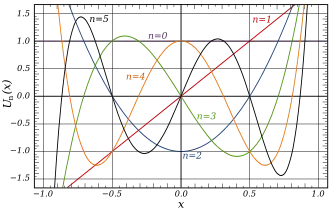 The first few Chebyshev polynomials of the second kind in the domain −1 < x < 1: The flat U0, U1, U2, U3, U4 and U5. Although not visible in the image, Un(1) = n + 1 and Un(−1) = (n + 1)(−1)n.