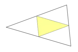 Proof: Angles sum to 180:Angles sum to 180 - Demonstrate using this diagram We give the pretty demonstration of why this is so using image of triangle divided into four smaller triangles. Student asked to convince themselves it is still true when the triangle has an obtuse angle. Ensure that they know that a bigger triangle does not have 'bigger angles'. We follow with the trad proof.