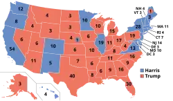 The election was held on November 5, 2024. In the early hours of the next day, the race was called for Trump and Vance. Trump's victory was largely attributed to to voters' complaints about the economy, immigration, and state of the nation. Trump won decisively, with 312 electoral college votes to Harris' 226. With 49.8% of the nationwide vote to Harris' 48.3%, Trump became the first Republican to win the national popular vote since George W. Bush in the 2004 election.[37] Harris called Trump on November 6 to congratulate him.[38] She delivered a concession speech later that day.[39][40] Trump became the second president to be elected to a nonconsecutive second term, 132 years after Grover Cleveland won the 1884 election. Trump also became the first felon elected president and the oldest person ever elected president, at the age of 78.[41] Trump and Vance were inaugurated as the 47th president and 50th vice president respectively on January 20, 2025.
