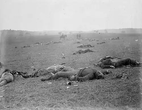 A Harvest of Death: dead soldiers await burial following the Battle of Gettysburg. NARA, public domain.