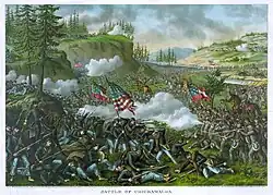 Chromolithograph of the Battle of Nashville. Note the Black soldiers advancing over the ridge.