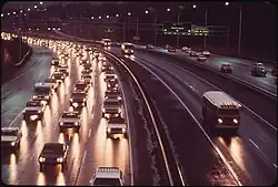 At the same time, the construction of long-distance, high-speed, high-capacity, limited-access roadways, such as those built as a part of Eisenhower's Interstate highway system, facilitated a lifestyle more dependent on the automobile--that is, it became practical and economical for most members of the workforce to live farther away from their jobs than they had ever lived.[1][2] Whereas earlier in the century the norm had often been for workers to live near their jobs in cities and take a relatively short drive, ride public transportation, or even walk to work, in the second half of the century it became far more common to live in suburbs miles away from jobs (which often remained in dense urban areas) because expressways and inexpensive gasoline facilitated much longer commutes. As suburbs grew, so did American oil consumption. Traffic, environmental, and indirect health problems often arose as suburbs grew beyond the capacity of the infrastructure already in place. This trend would have important bearings on U.S. energy and environmental policy in the 70s and in the new millennium.