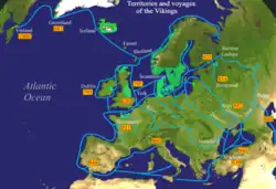 In the eighth century, pushed from their homes in Scandinavia by war and population expansion, Norsemen, or Vikings, began settling parts of the Faeroe, Shetland, and Orkney Islands in the North Atlantic. They went where ever treasure was, trading as far as Byzantium and Kiev in the East. In the West they raided from Ireland and England down to the Italian peninsula, sailing into a port, seizing its gold, and murdering or enslaving its people before fleeing. They began settling Iceland in approximately 874 CE. A Viking called Erik the Red was accused of murder and banished from his native Iceland in about 982. Eric explored and later founded a settlement in a snowy western island. Knowing that this bleak land would need many people to prosper, Eric returned to Iceland after his exile had passed and coined the word "Greenland" to appeal to the overpopulated and treeless settlement of Iceland. Eric returned to Greenland in 985 and established two colonies with a population of nearly 5000.