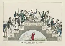 The Petticoat Affair is also known as the Eaton Affair. Happening in the U.S. between 1830-1831. It was a U.S. scandal involving President Andrew Jackson's cabinet and their wives. Even though this was a private matter, it still troubled several men in their political careers.[2] The Petticoat affair involved Peggy Eaton who was accused of having an affair with a man by the name of John Eaton during the time she was married to purser John Timberlake. Daughter of William O Neal, Peggy remained close to politics her father owned the Washington D.C Boarding House for politicians where Peggy worked. Peggy frequented the boarding house which later gave spectators more discrepancies in Peggy's character as she looses popularity. Peggy husband died while on sea and many believed it was a suicide after being revealed to of his wife Peggy's affair with John Eaton who was a good friend of couple. Although Timberlake's death was said to be a result of pneumonia. Peggy married John Eaton less than a year after her husbands death. Many surrounding women felt like the marriage of Peggy and John Eaton was not the correct thing to do. The alleged affair controversy ultimately assisted many men in Andrew Jackson's cabinet to resign from their position, including John Eaton himself. People begin to judge Jackson on the his position on the marriage. Andrew Jackson recommended that John Eaton and Peggy should get married, Jackson views resulted on from his personal experience he had with his first wife.A group of women emerged claimed to be Anti-Peggy who was led by Floride Calhoun. The women who emerged proclaimed rights and guidelines that women have to follow after death of husband including that they mourn and wear black for a year following their death.