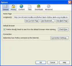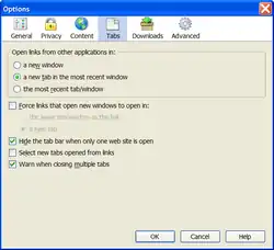 These options are mostly self explanatory. When another application (AOL Instant Messenger, for instance) tries to open a link, this preference will tell Firefox where to do it. The first two are easy enough to figure out, while the third will simply reuse the window that was most recently focused (replacing its contents).