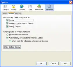 The Update tab changes the way Firefox checks for updates for itself, extensions and themes, and search engines. All three should remain checked, as critical security updates will use the Update system.