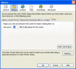 Pages you view are stored in the cache for faster viewing later on. As you visit pages, Firefox will automatically save copies of them. If you navigate to the same page later, Firefox will use the page saved rather than downloading it again. With this setting, you can set the size of the cache.