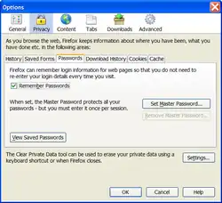 Firefox also has the option to set a Master Password. Without one, Firefox will automatically enter any password that is stored--regardless of who is using the browser at that time. A Master Password will cause Firefox to prompt the user for a password before it will enter any saved passwords. However, it will only prompt once per session, meaning as long as the browser remains open. To prevent unauthorized use of passwords, be sure to close the browser when you are finished using it (if you entered a Master Password). The Master Password can also be unset from this window.