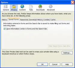 Checking the box (which is the default setting) will have Firefox save any data that is entered in a form. This includes things like the Google search box, any contact information (Name, Address, Email, etc) and other search boxes. Also, the Search Box included on the default Firefox toolbar (accessible by pressing [Ctrl]+[K]) Unchecking this box will stop Firefox from saving this information. Pressing the Clear Saved Form Data Now button will remove all the data currently stored by Firefox.