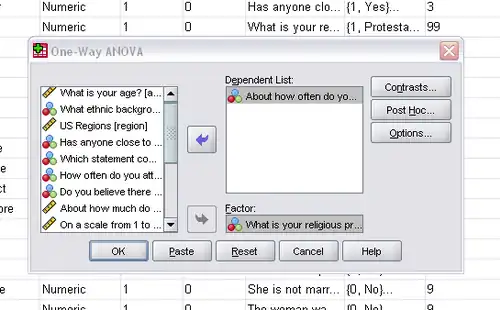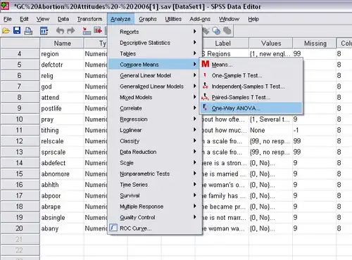To conduct a One-Way Analysis of Variance (ANOVA) test in SPSS, you must first begin by choosing two variables. The variables we will use in this example are religious affiliation and frequency of prayer. Basically we are asking, “Does religion affiliation have an influence on how often people pray?”