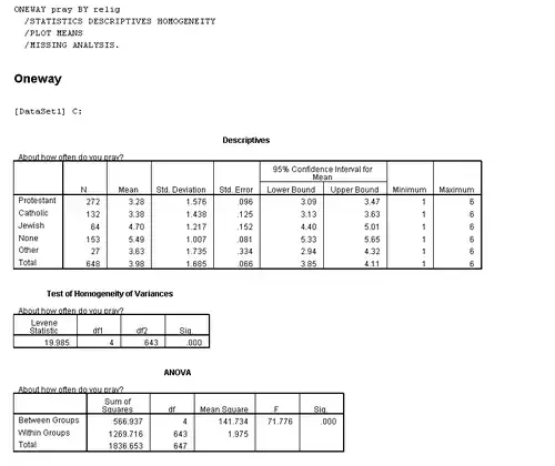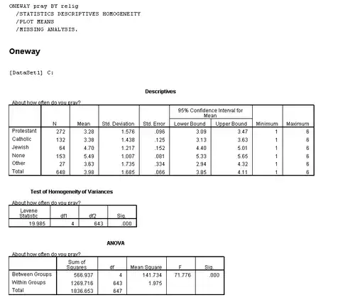 The Descriptives table provides various descriptives for the groups being compared, including the group sample size, mean, standard deviation, minimum, maximum, standard error, and confidence interval for the mean. In this example, there were 64 Jewish individuals, the mean frequency of prayer was 4.70 (on a six point scale; technically it is an interval-like ordinal variable), and the standard deviation was 1.217. There were 132 Catholic individuals with a mean frequency of prayer at 3.38, and a standard deviation of 1.438.