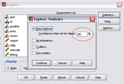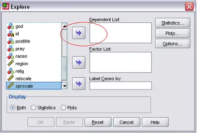 To compute a confidence interval in SPSS, you begin by selecting “Analyze” → “Descriptive Statistics” → “Explore.” Once the “Explore” window pops up, scroll down on the left list until you find “sprscale,” then click on the arrow that will send it to the dependent list: