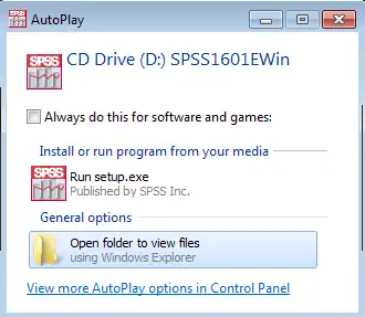 In Windows, once you insert the SPSS installation disc you will likely receive some sort of prompt as the disc will "autoplay." The initial prompt in Windows 7 looks like this: