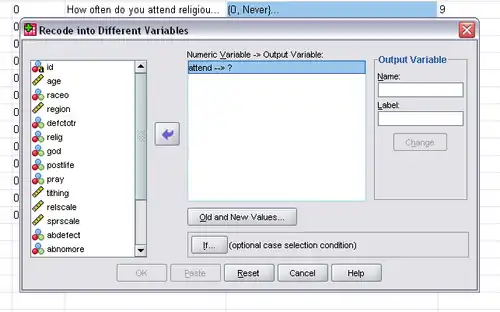 Click on “Recode into Different Variables”, as choosing the “Recode into Same Variable” would destroy the values of the existing variable. (The only time you'd use that is when fixing fouled labels.)