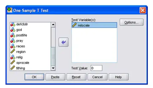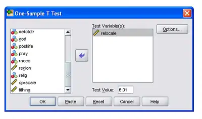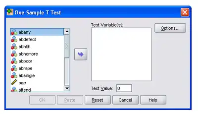 (Note: It's not uncommon for beginners to leave the "Test Value" box blank. And, for some reason, SPSS puts a default value in the box of zero, which means the test will run if you don't put your target value in the box as SPSS will assume your target value is zero. Just make sure you put the correct target value in the "Test Value" box.)