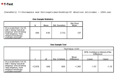 The second table tells us whether or not the difference between the two is likely due to chance. The first column is the t-statistic. Using a t-table, one could use this value to determine whether or not the two means are significantly different. SPSS does the calculations for you. The next column, "df," provides your degrees of freedom, which is n-1 for single sample means tests. The third column, Sig. (2-tailed), provides the p-value for this particular test, which is the probability of finding the difference between the genetic counselors' mean and the general U.S. adult population mean we found (again, this is hypothetical) simply due to random error (assuming they are actually the same). In our example, the p-value is .000, which is smaller than the standard p-value used in statistics of .05, indicating the odds of us finding this difference if the population means are the same simply due to chance is less than 1 in 1000. In this case, we would reject the null hypothesis that there is no difference and accept the alternative hypothesis that there is a difference between genetic counselors and the general population in their average religiosity.