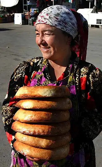 Uzbeks usually eat three meals a day. In the morning, along with their traditional bread called non, they drink tea and milk. Summer breakfasts also often include grapes. Uzbeks in rural areas almost never buy bread from a store, but rather bake their own bread daily in a special oven called a tandir. Most rural families also have their own cows which provide milk.
