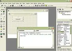 Code editing is done using the code module windows. The title text of a code module window shows the project and module name. Two dropdown lists show the objects accessible to that module (General) and the subroutines (Declarations) associated with the selected object in the General list. In a form's code module, the General list will list all of the controls that have been placed on the form. Each control has its own set of events and methods, which will populate the Declarations list upon selection of any control. These two windows combined help the programmer locate specific code for events and methods in the program. In small programs, the editors can be scrolled up and down to find a desired routine to work on. In large programs finding the right spot can be much more difficult, where these two lists bring the programmer to the desired location using a few clicks of the mouse.