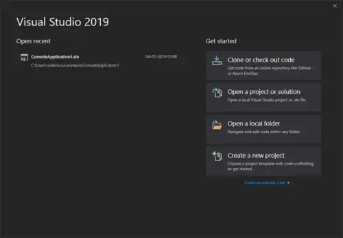 When VS 2019 first launches, it goes to a welcome screen which shows the latest recent projects and some useful places (like creating a new project) to start. If you click the "Continue without code" option, it goes straight to the IDE, much like older versions of Visual Studio.