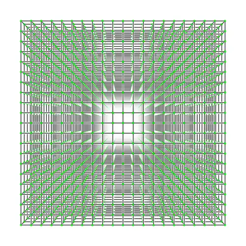 Each line represents a bond between two ions in a crystal of NaCl (sodium chloride = ordinary salt). Blue and green distinguish the two kinds of ions. It is a centered cubic crystal. Each Na+ ion is surrounded by 8 close neighbors Cl-. Likewise, each Cl- ion is surrounded by 8 close neighbors Na+. Two nearby ions always have opposite charges, because opposite charges attract each other while charges of the same sign repel each other.