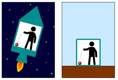 The equality of inertial mass and gravitational mass means that the acceleration of an elevator in free fall caused by gravitation is always equal to that of its passenger. This is why the passenger cannot observe the effect of gravity in a free-falling elevator. Everything happens as if it were not subject to any force, as if it were weightless.