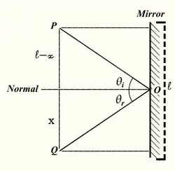 Figure 3.1 shows the wave vector and wave front of a wave being reflected from a plane mirror. The angles of incidence, , and reflection, , are defined to be the angles between the incoming and outgoing wave vectors respectively and the line normal to the mirror. The law of reflection states that . This is a consequence of the need for the incoming and outgoing wave fronts to be in phase with each other all along the mirror surface. This plus the equality of the incoming and outgoing wavelengths is sufficient to insure the above result.
