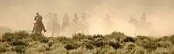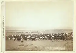 The long drive was difficult for both the cowboys and the cattle. If the cowboys made the cattle go too many miles in a day, the cattle might become underweight and unhealthy. They usually traveled 15 miles a day, which meant it took around 3 months to make the journey. There were about 3,000 head of longhorns in a herd. For each herd, there were about 10 cowboys to help them along, with 3 horses per cowboy. The trail boss handled negotiations with settlers and Native Americans along the way. They were paid at least $100 per month. Cowboys were in their saddles all day, slept on the ground, and bathed in rivers. Cooks drove the supply wagons and handled medicines. There were a lot of dangers in the job. Even the slightest sneeze could set the herd off in a stampede. There were many storms out on the plains, and metal attracts lightning. So they put all their metal possessions at the edge of the camp away from the cattle. [64][65][66]