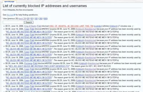 It is helpful for all involved, especially AOL users, who are often chronically autoblocked by collateral damage, to remain patient and remember that it is the software, not the admin who is unfortunate enough to have his or her name appear on the block, who is responsible. Equally important is for admins to check Special:Ipblocklist regularly, and unblock all autoblocks from a particular user if more than two autoblocks are set in rapid succession. (If more than two IPs are autoblocked within seconds/minutes of each other, it is a good indication that it is a dynamic IP pool and the blocks are collateral damage.)