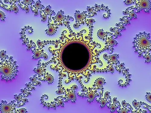 Picture is from Pictures of Julia and Mandelbrot Sets. The mathematically interesting point about the picture is the smooth colouring, based on distance to the set, rather than the more usual banding of colour based on number of iterations before leaving the unit circle. The distance is converted to a height, which then makes a 3D surface that can be lit.