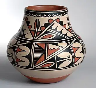 Maria Martinez is a famous pottery maker known for her recreation of traditional Puebloan designs. Her most famous pots have matte black designs on a shiny black surface.