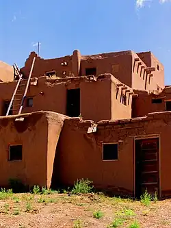 One very famous pueblo is Taos Pueblo. It has a multi-storied residential complex of reddish-brown adobe. The Rio Pueblo River runs through the middle of the pueblo. Pueblo people built this pueblo between 1000 and 1450 A.D. About one hundred and fifty people still live there today.